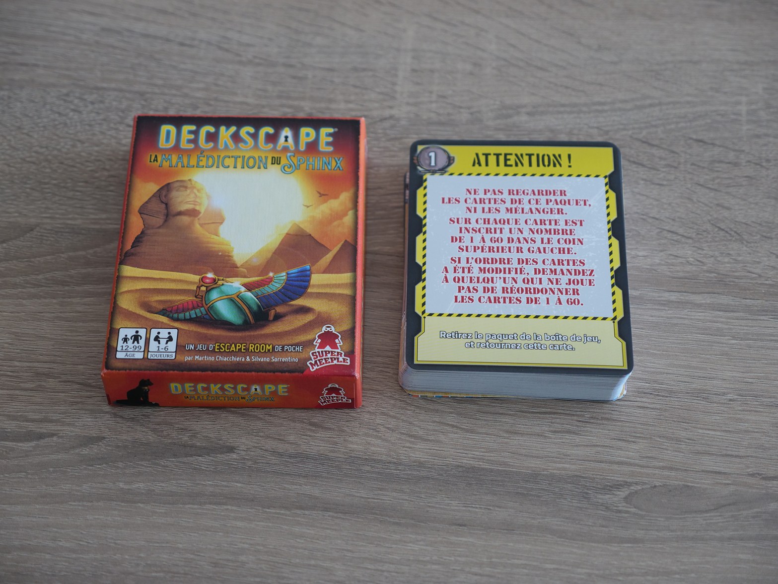⏱️ 60 min 👶 12 ans et + 👫 1 à 6 joueurs Deckscape est un jeu d’escape game de salon. Saurez-vous déchiffrer les hiéroglyphes et révoquer la malédiction du Sphinx avant que la momie ne se saisisse de vous ? ❷ Idéal pour deux joueurs Caution : 10€