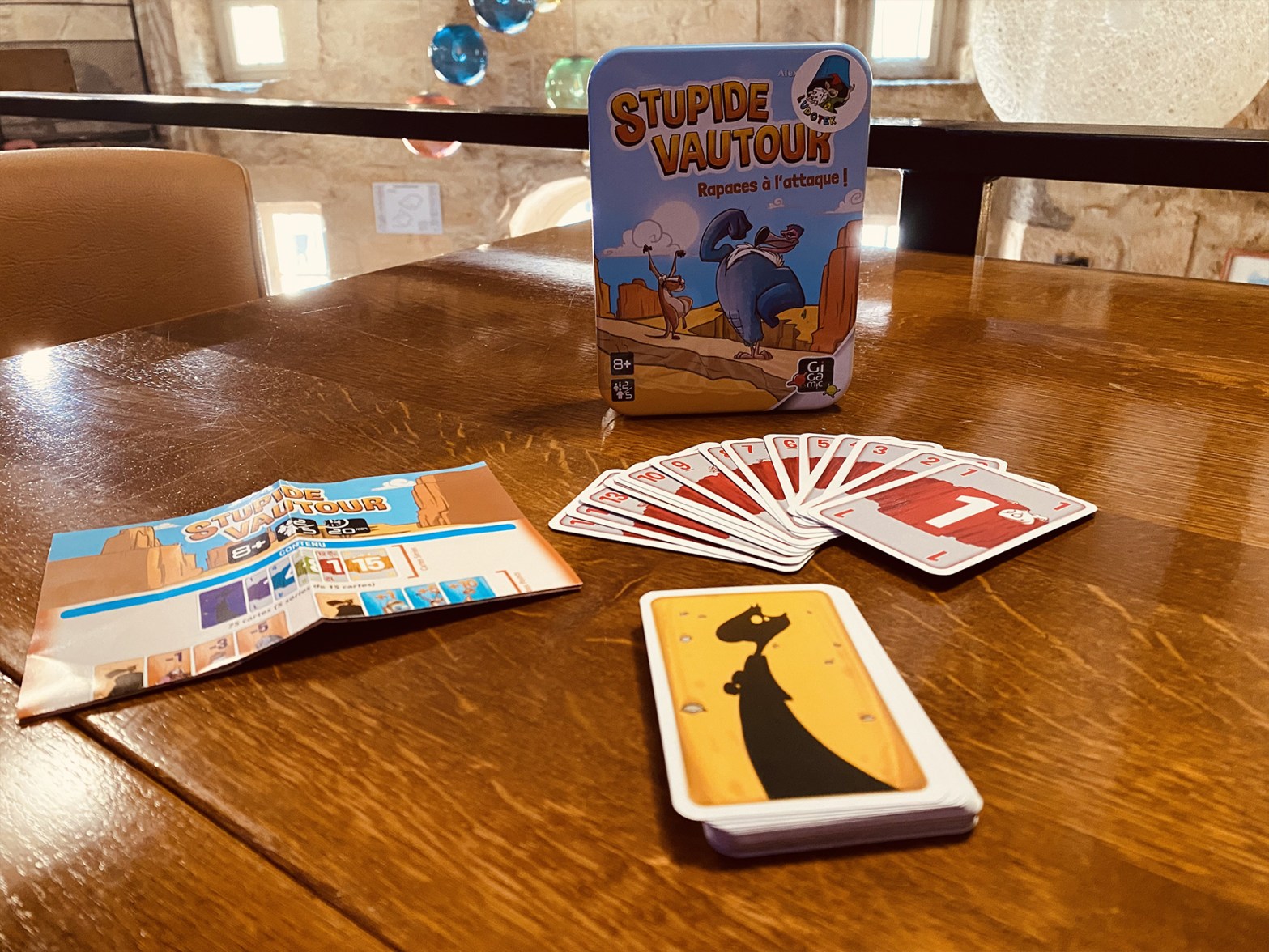 ⏱️ 30 min 👶 8 ans et + 👫 2 à 5 joueurs Stupide vautour est un jeu simple et délirant qui revisite la mécanique du jeu de plis. A chaque tour, on retourne une carte de la pioche, tous les joueurs posent alors une carte de leur main, face cachée, puis la retournent simultanément. Si laLire la suite « Stupide vautour »