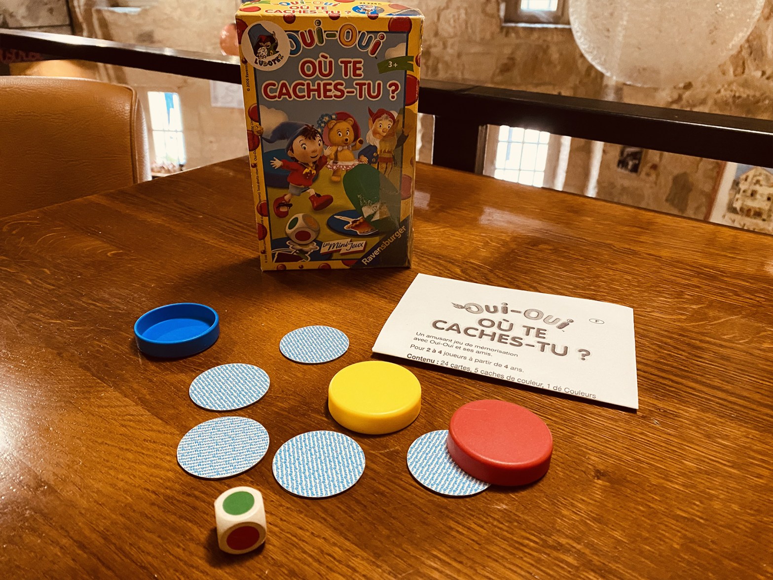 ⏱️ 30 min 👶 4 ans et + 👫 2 à 4 joueurs Oui-Oui – Où te caches-tu ? est un jeu de mémoire pour les plus petits. Trente pastilles rondes sont étalées sur la table. Six d’entre elles sont recouvertes d’un gros jeton de couleur. Après avoir jeté le dé des couleurs, on doit nommer laLire la suite « Oui-oui où te caches-tu ? »