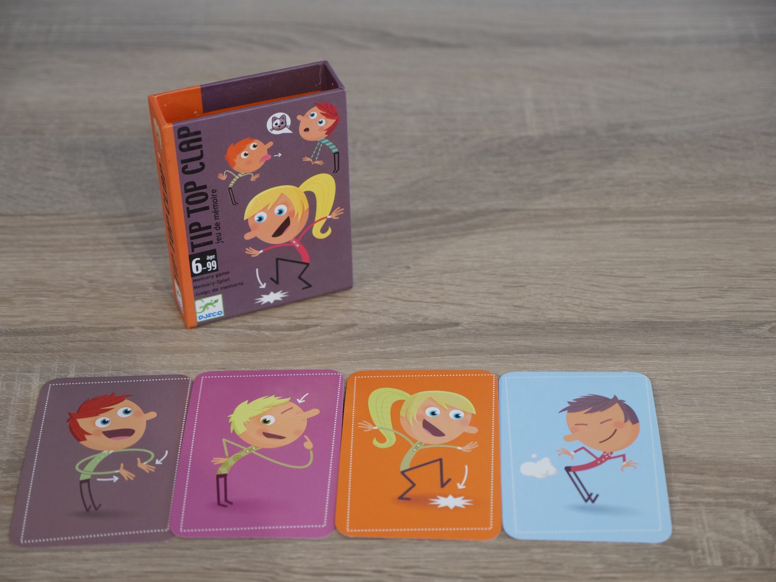 ⏱️ 30 min 👶 4 ans et + 👫 2 à 5 joueurs Dans tip top clap, à vous d’avoir le plus de mémoire. Une suite de bruits et de mimes se crée et s’allonge au rythme du jeu… Rires assurés pour ce jeu de mémoire inédit !